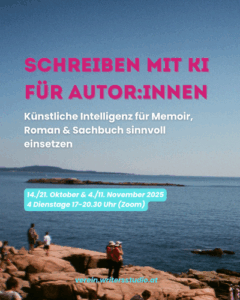 PS: Wie ihr wisst, sind wir sehr für das Schreiben mit der Hand, der ureigenen Themen und mit authentischer Voice. Deswegen brauchen wir keine KI zur Generierung fertiger Texte. Kreative Intelligenz statt KI- Phrasen, ist unser Motto. Dennoch, manche KI-Tools können hilfreich sein. Ich z.B. nutze Turbo Scribe, um meine handschriftlichen Rohtexte zu digitalisieren. Dann kann ich sie munter in Word überarbeiten. Irene Steindl hält diesen Herbst einen neuen KI-Workshop für Menschen wie mich, die gerne selbst schreiben, selbst denken und selbst formulieren: Schreiben mit KI für Autor:innen: Künstliche Intelligenz für Memoir, Roman & Sachbuch sinnvoll einsetzen. 4 Dienstag-Abende per Zoom ab 14. Oktober.